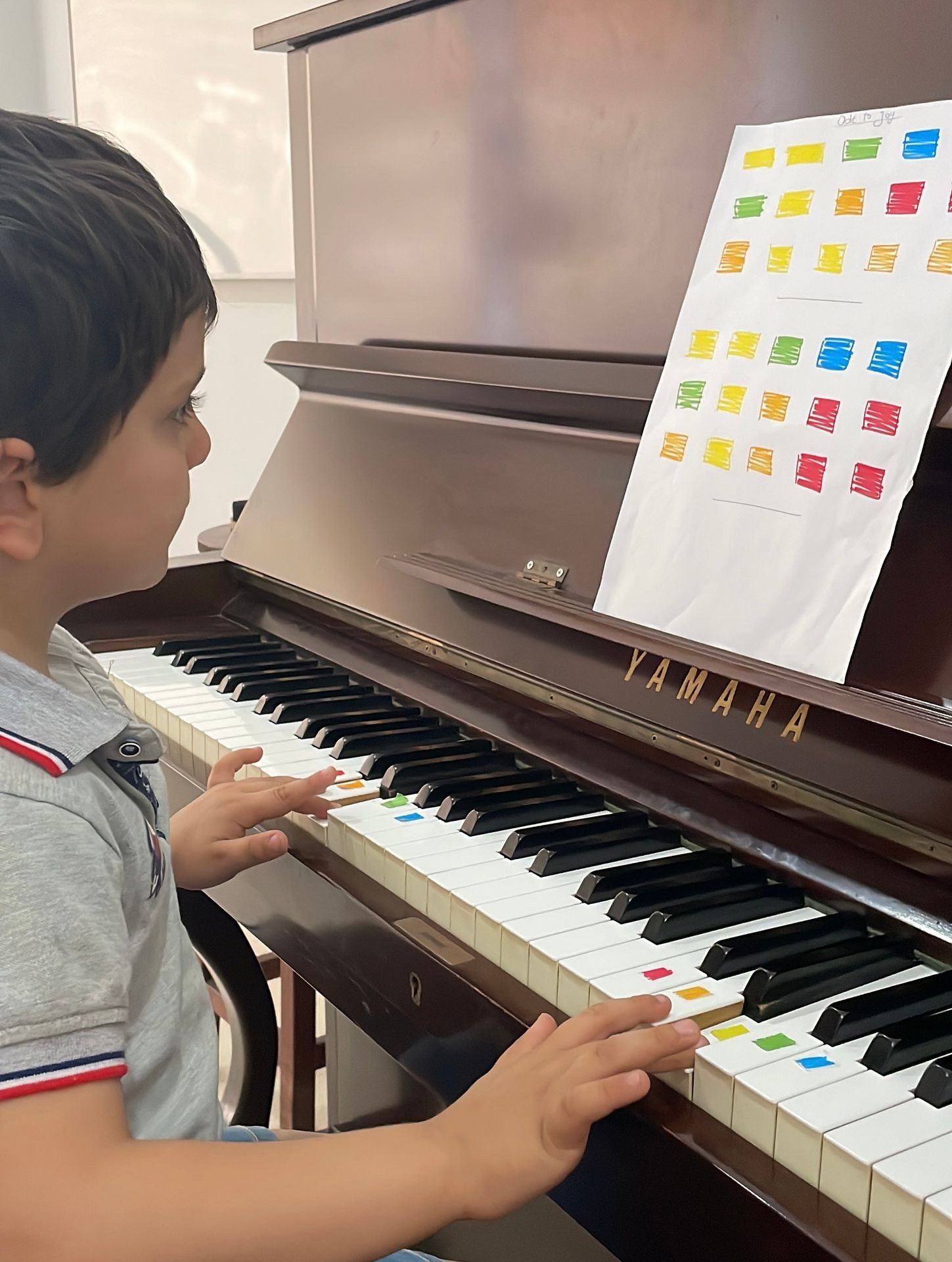 Using colors and shapes to identify notes, the student will learn how to play the piano correctly using both hands, identify musical notes and beats.